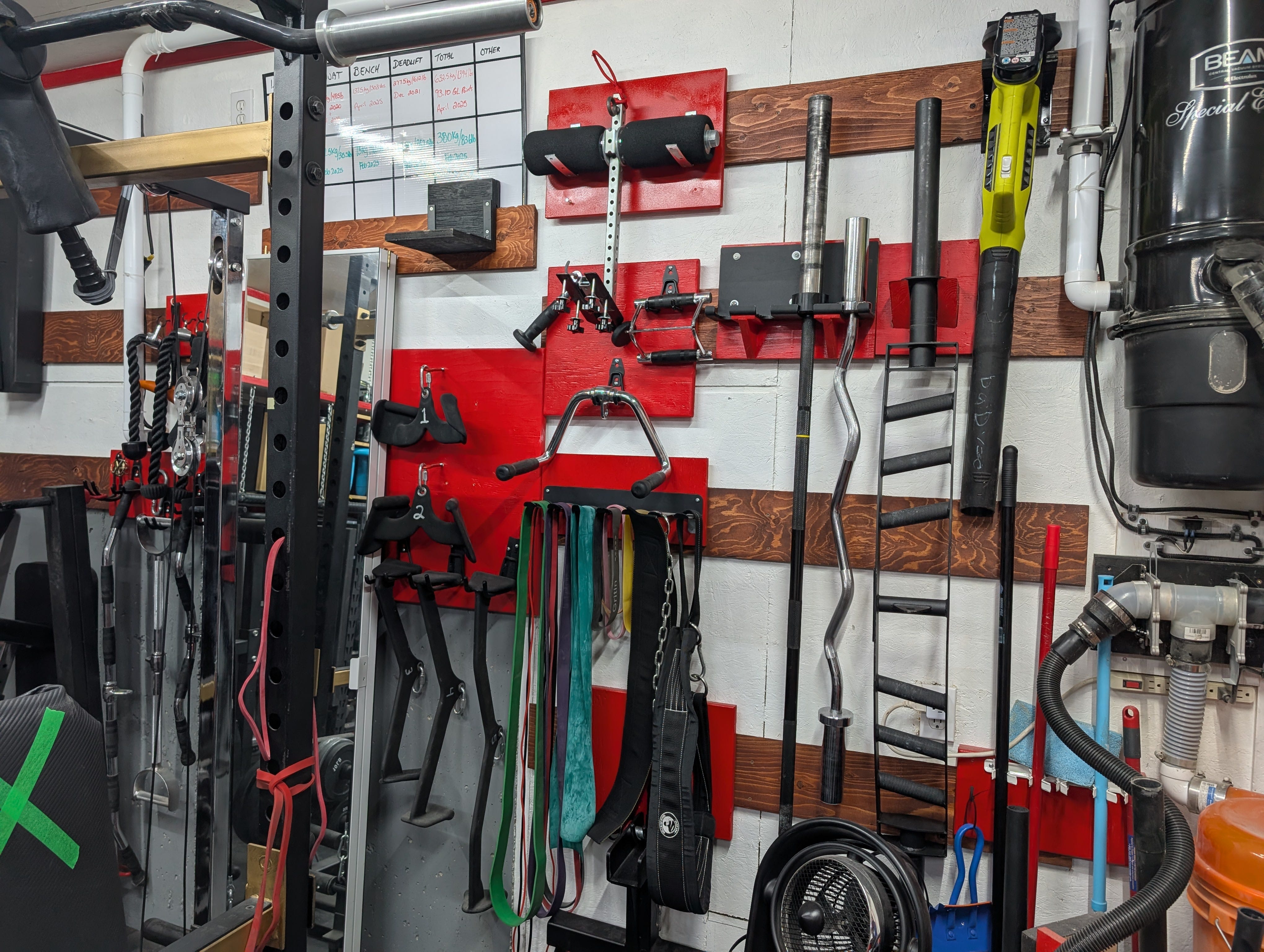 If I wanted to make the most out of my space, I had to get creative. I tried out making a French Cleat system to hang some of my accessories on. I had never made anything like it before, and I screwed it up a few times. The finished product works well for my space. I can re-arrange the location of equipment as my needs change.